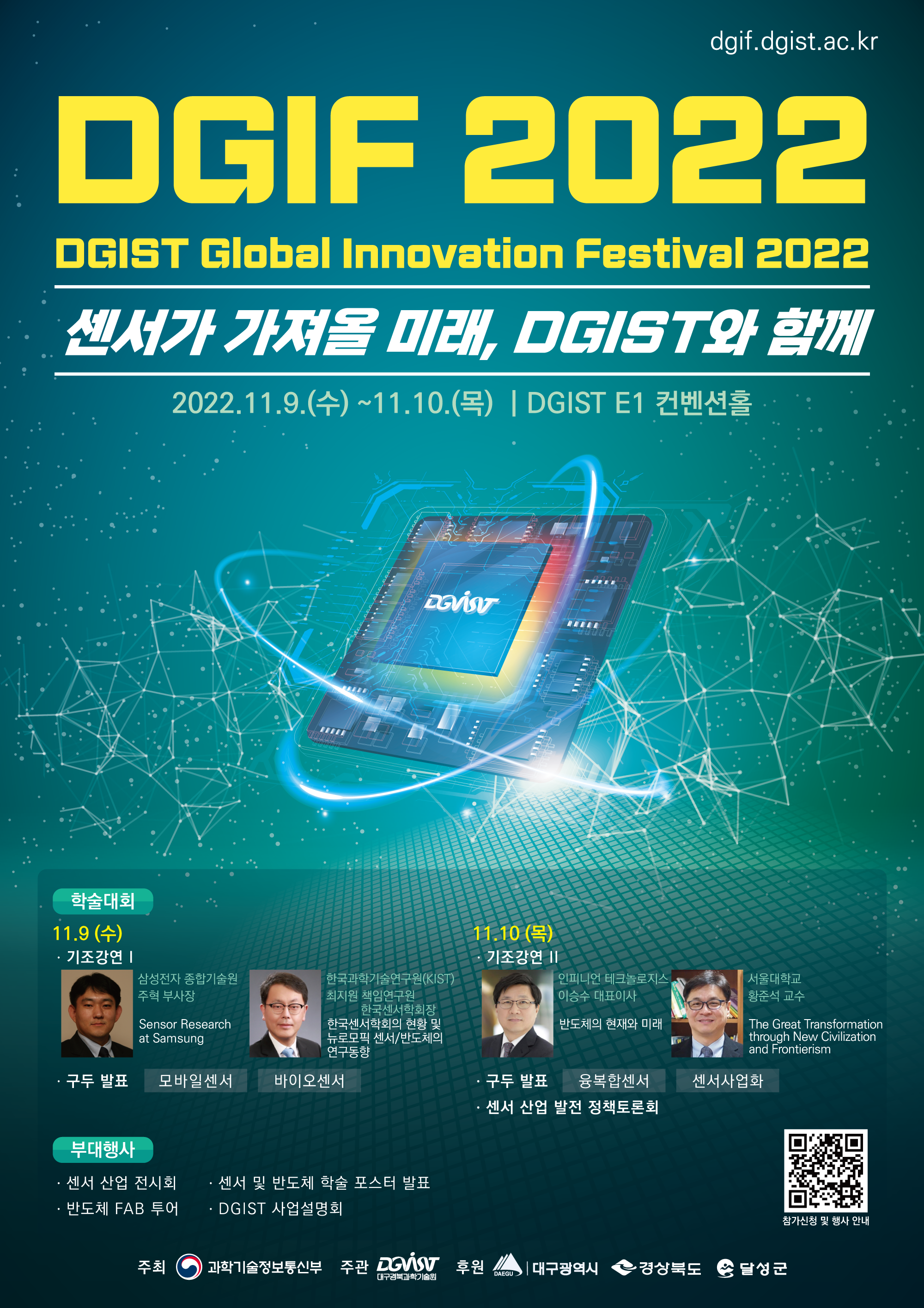 1. DGIST(대구경북과학기술원)에서는 매년 DGIF(DGIST Global Innovation Festival) 행사를 개최하고 있으며, 2022년에는 센서와 반도체를 주제로 11월 9일(수)~10(목)에 개최합니다.